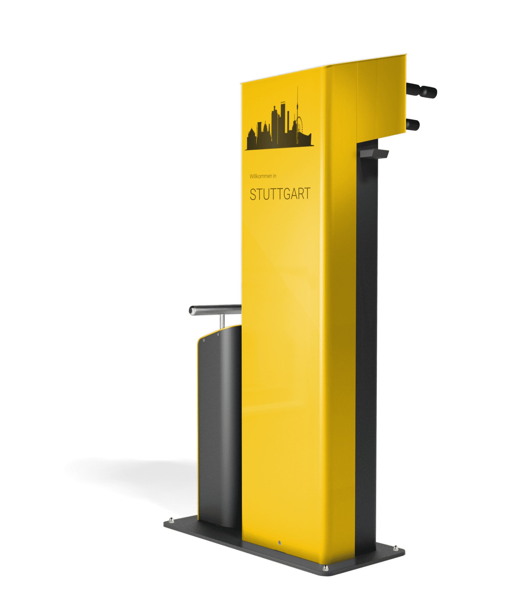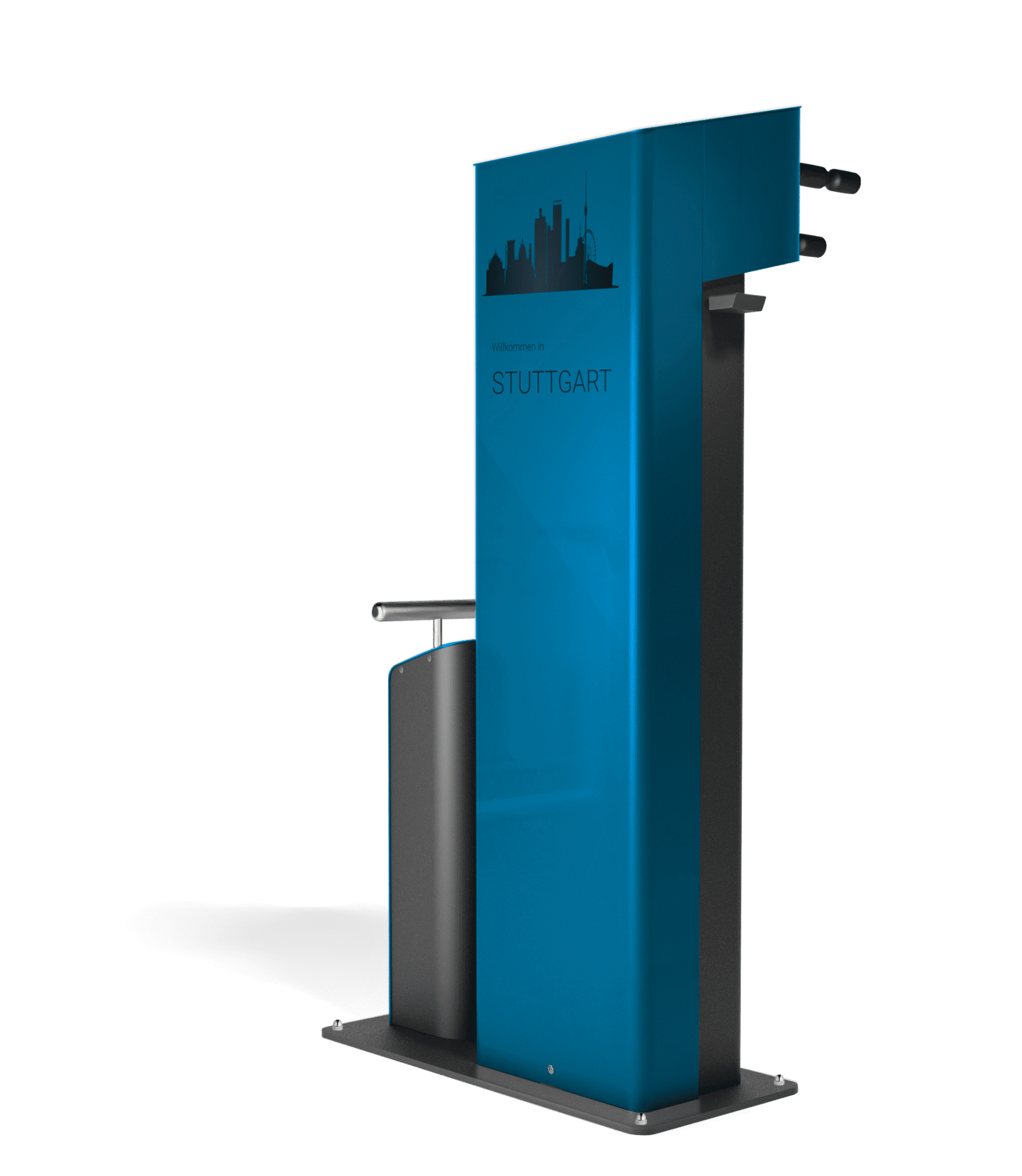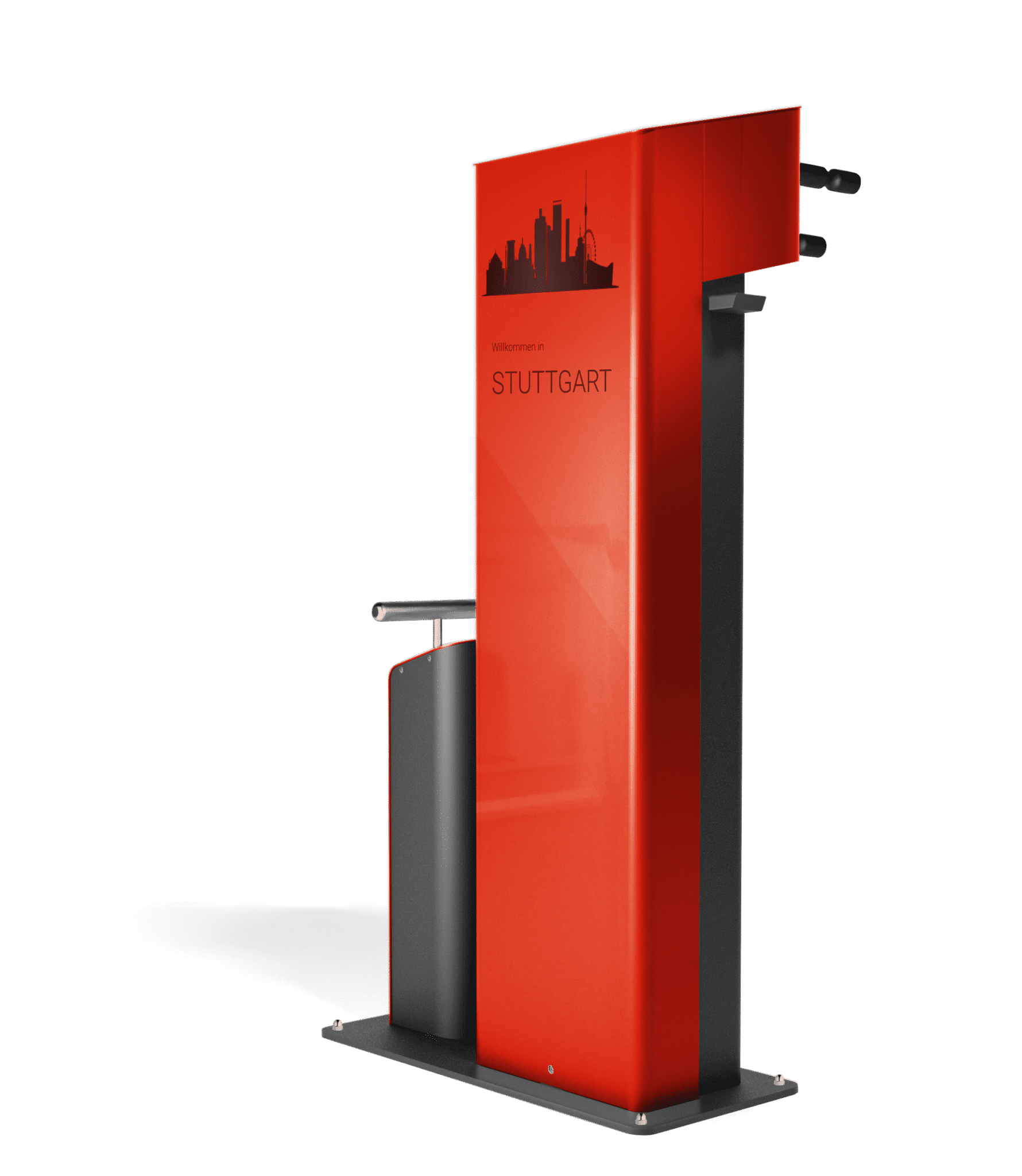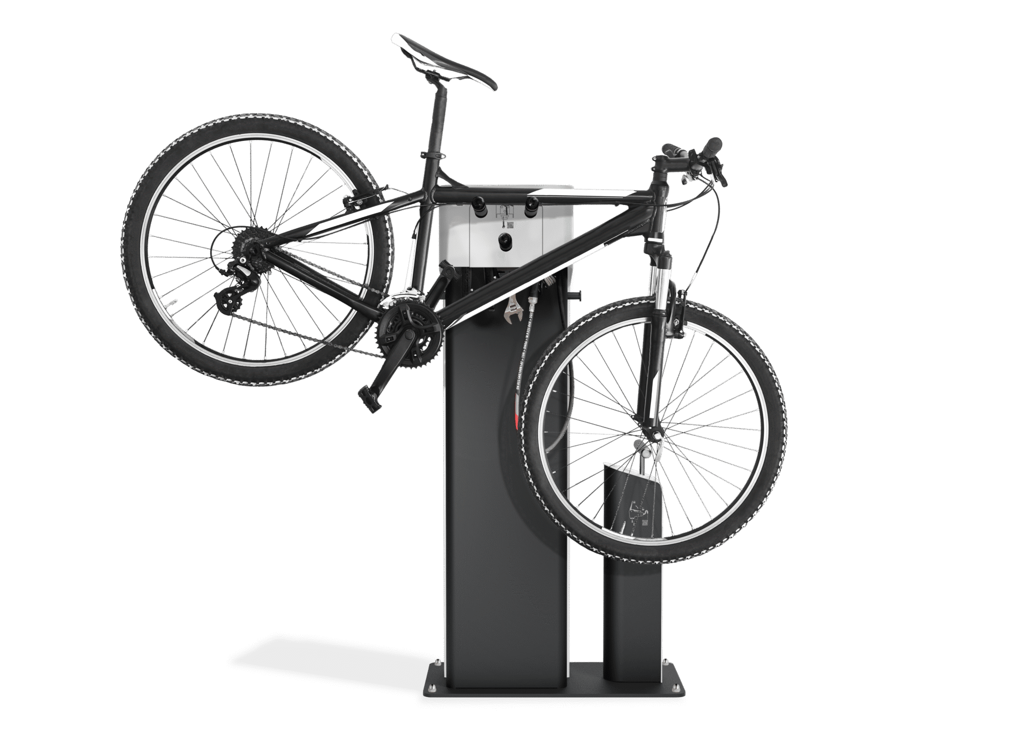 The bicycle repair station is finished with an outdoor powder coating (according to corrosion protection classes according to DIN EN, category C4. This category corresponds to an industrial atmosphere and coastal atmosphere with moderate salt exposure.