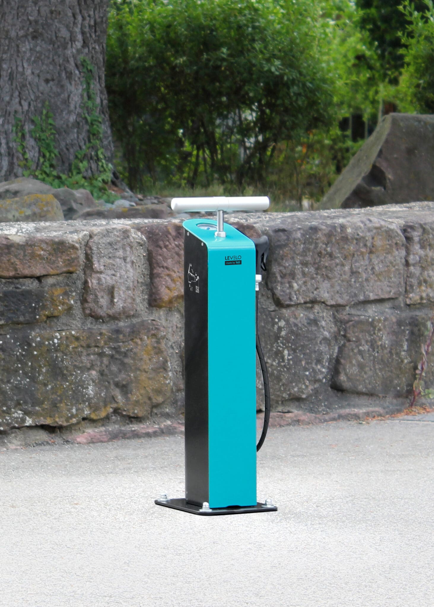 The bicycle repair station is finished with an outdoor powder coating (according to corrosion protection classes according to DIN EN, category C4. This category corresponds to an industrial atmosphere and coastal atmosphere with moderate salt exposure.